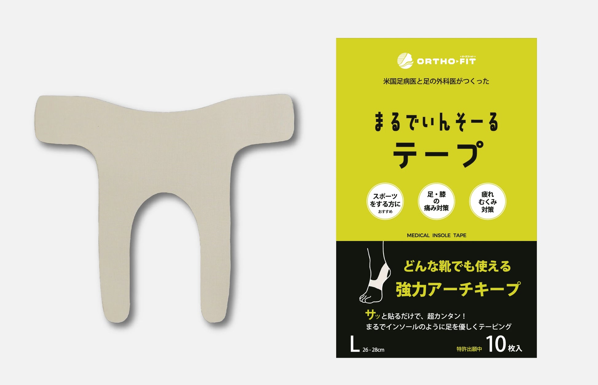 ハイパフォーマンスの秘訣は足元から。医療用インソールの理論を用いた特殊構造で足のアーチを強力サポート。サッと貼るだけで、超カンタン!まるでインソールのように足を優しくテーピング。