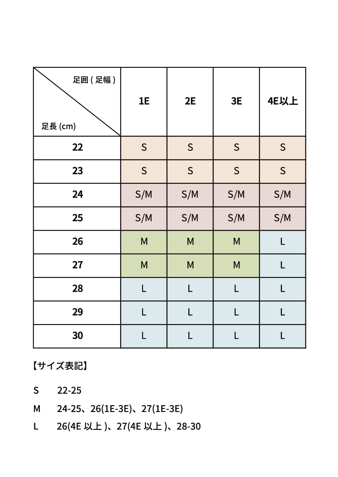 S【22-25cm】 / M【24-25,26(1E-3E),27(1E-3E)cm】 / L【26(4E以上),27(4E以上),28-30】