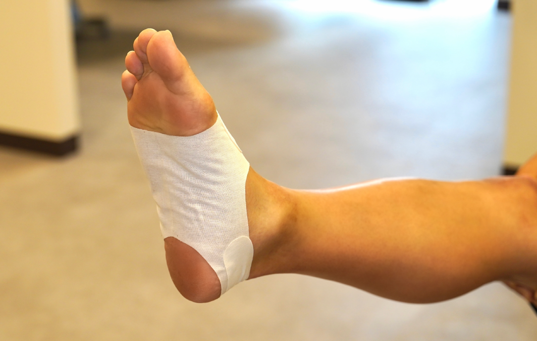 だからこそ、医療用素材を使用した足裏アーチサポートテーピング。貼った瞬間、足が引き上がるような感覚。医療用インソールの理論を用いた特殊構造が足裏アーチを直接サポートする設計にしました。体幹のブレが補正され、安定感を即実感していただけます。